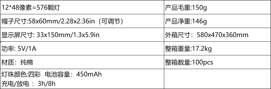 本產(chǎn)品是深圳市好彩陽科技有限公司自主研發(fā)生產(chǎn)的一款產(chǎn)品-LED 顯示屏帽子。采用高質量純棉+FPCB。使用APP操作 支持文字 DIY 涂鴉 動畫 圖片 燈效 時鐘等功能。電池供電,續(xù)航時間長,使用方便。尺寸和重量滿足跨境物流標準,大大節(jié)約了運輸和配送成本。非常適合聚會派對 節(jié)日活動 戶外露營 夜跑 等場所。